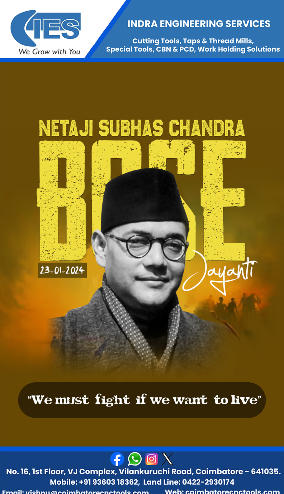 *Netaji Subhas Chandra Bose Jayanti* is celebrated on *January 23rd* every year to commemorate the *birth anniversary* of one of India's most prominent freedom fighters who played a significant role in the struggle for *India's independence* from British colonial rule. He formed his own political party called *Forward Bloc* and established *Azad Hind Fauj* or the Indian National Army (INA). His famous slogan is *"Give me blood and I will give you freedom"*.